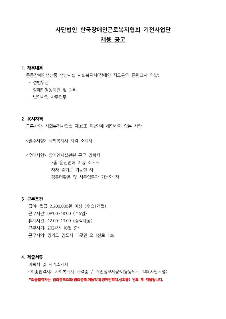 23사단법인 한국장애인근로복지협회 기전사업단 채용 ..
