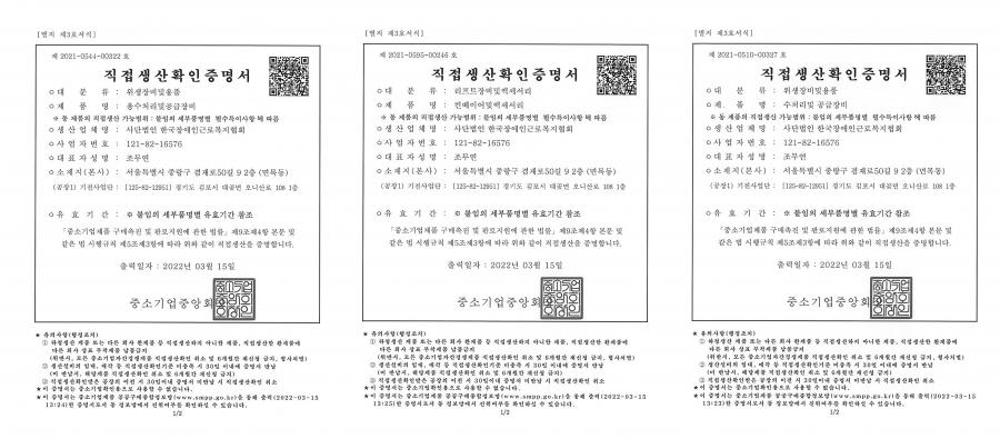 생산시설: (사)한국장애인근로복지협회 기전사업단 / 사업자등록번호: 125-82-12951 / 대표: 조무연 / 개인정보책임자: 조무연